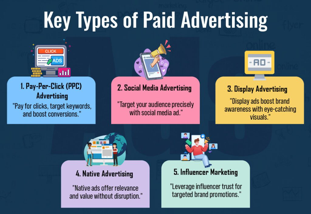 Paid advertising is an essential component of a well-rounded marketing strategy, allowing businesses to reach and engage their target audiences effectively. By understanding the different types of paid advertising—such as PPC, social media ads, display ads, native advertising, and influencer marketing—you can leverage their benefits to drive growth and success.